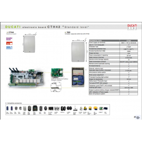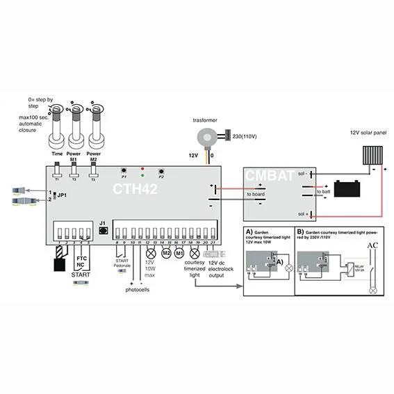 Radiocommandes DUCATI Rolling Code. Sélecteur à clé avec contact NO (normalement ouvert). Photocellules de sécurité avec alimentation 12V et contact NC Feu clignotant 12V max. Module chargeur de batterie CMBAT. Batterie de secours 12V (Attention : le CTH42 nécessite que le module CMBAT soit alimenté par batterie de secours).