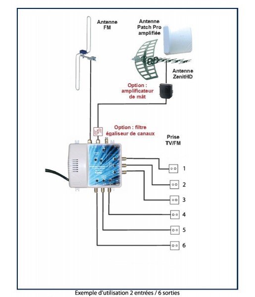Amplification et distribution des signaux TV Terrestres numériques TNT à l’intérieur des petits collectifs ou maison individuelle multi téléviseurs. 2 entrées pour antennes UHF / III / FM. Répartition de 6 sorties intégrée dans le boîtier.