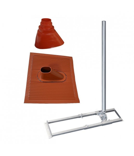 Support de chevrons de toit rouge avec mât acier 1m, manchon et tuile étanche, idéal pour fixer solidement une antenne parabole jusqu’à 90 cm.