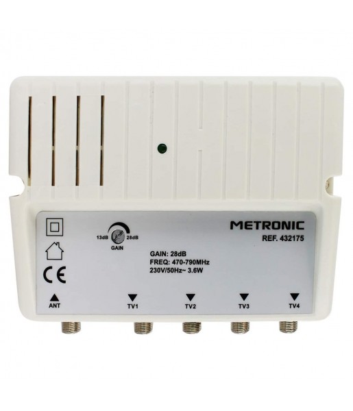 Amplificateur Répartiteur Blindé Réglage de Gain 4 Sorties Fiche F Metronic 432175 Blanc - Gain 28 dB, Fréquence 470-790 MHz