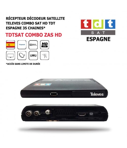 Offrez-vous un accès illimité aux chaînes espagnoles en haute définition grâce au Récepteur Décodeur Satellite Televes COMBO SAT HD, TDT 35 Chaînes Espagnol Numériques Terrestres Via Hispasat En Haute Définition. Ce combo innovant vous permet de recevoir à la fois les chaînes satellites et terrestres (TDT SAT) en qualité HD, directement via le satellite Hispasat 30°Ouest, sans abonnement mensuel.