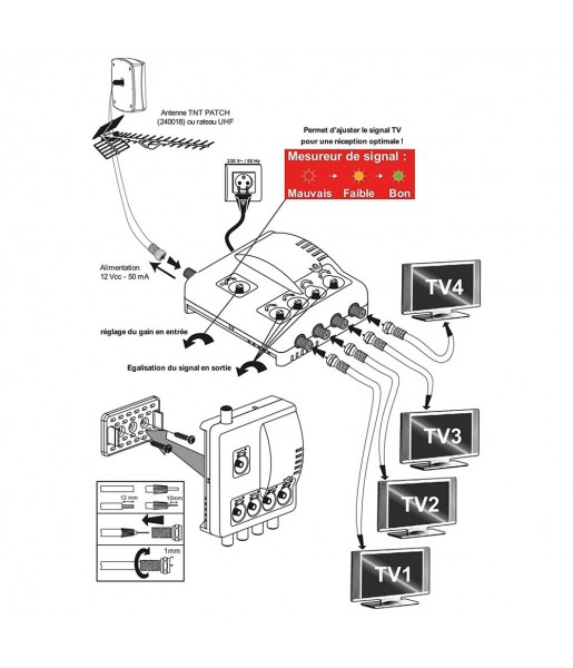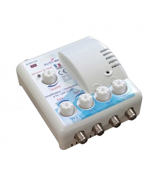 Amplificateur distributeur intérieur 4 sorties F UHF Tonna 402664 - Filtre LTE 700 4G 5G, Gain 22 x 4 dB, réglable avec mesureur