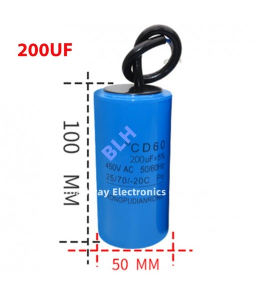 Condensateur de démarrage avec coque en plastique, cellule électrolytique, CD60, 450V, 450ylique, 200UF. Les condensateurs de démarrage sont largement utilisés dans les réfrigérateurs, climatiseurs, moteurs à courant alternatif, pompes à eau, générateurs, machines à laver, appareils électroménagers, produits électroniques, etc.