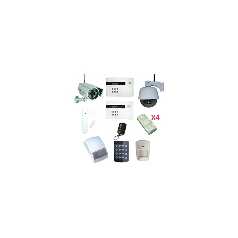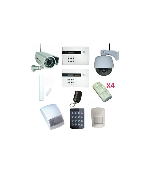 Pack alarme sans fil 1 centrale + 1 détecteur de mouvement + 1 télécommande + 4 Détecteurs extérieur + 3 Détecteurs douverture + 1 Clavier à code + 1 Sirène + 1 Transmetteur téléphonique + 1 caméra IP extérieure + 1 Caméra IP dôme