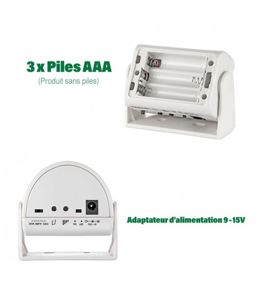 Alimentation : fonctionne avec 3 piles AAA (non incluses) ou adaptateur secteur 9-15V