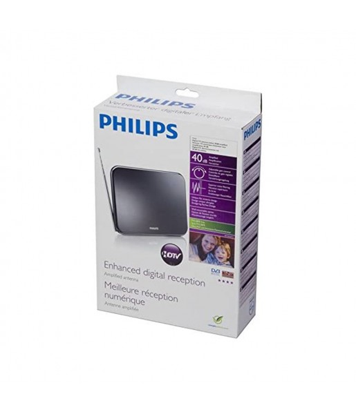 Antenne TV TNT Numérique d'intérieur HDTV/UHF/VHF/FM PHILIPS SDV622412 - Amplification 42 dB, Filtre 4G/GSM, Noir