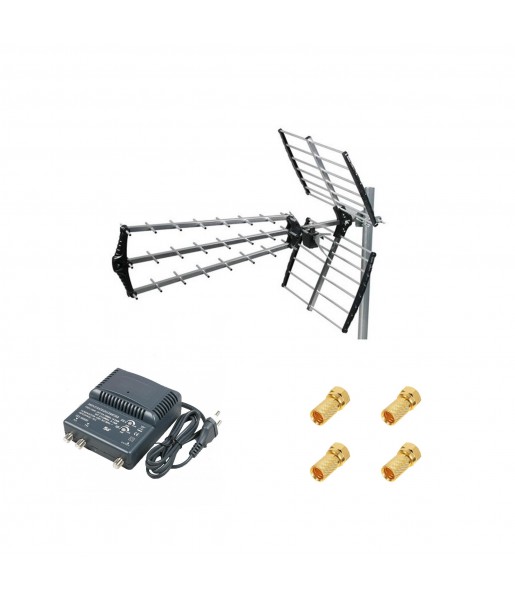 Kit Antenne TNT Trinappe Gain 18dB + Amplificateur TNT 2 Sorties + 4 Fiches F