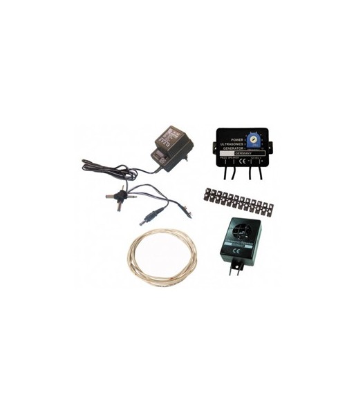 Générateur ultrason 12-15V 10-40kHz (réf. RU2), conçu pour repousser chauves-souris, rats, moustiques et mulots grâce à des fréquences variables.