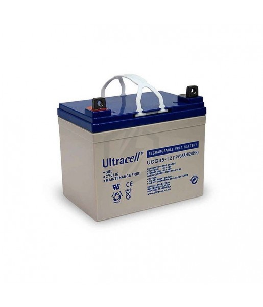 Batterie Gel Ultracell UCG35-12 Application : - Batterie biomédicale ; - Batterie chariot de golf ; - Batterie décharge lente Bateau / Marine ; - Batterie décharge lente Camping Car ; - Batterie décharge lente Energie solaire / Éolienne ; - Batterie décharge lente Stationnaire ; - Batterie décharge lente caravane ; - Batterie fauteuil roulant ; - Batterie jouet ; - Batterie modélisme ; - Batterie vélo électrique. Caractéristiques: - Voltage (V) : 12 ; - Capacité de batterie (ah) : 35 ; - Longueur (mm) (+/- 2mm) : 195 mm ; - Profondeur (mm) (+/- 2mm) : 130 mm ; - Hauteur (mm) (+/- 2mm) : 180 mm ; - Poids Kg (+/-5%) : 11.5 kg ; - Entretien : Sans entretien ; - Gamme : UCG ; - Polarité : Polarité +- ; - Position Borne + (face à vous) : Gauche ; - Technologie : Gel ; - Type de bac (listeaux) : ABS (UL94:HB) ; - Type de borne : Insert fileté M6 (vis inclus) ; - Vie de cycle: 900 cycles à 50% de profondeur de décharge selon la norme EN 60254/1 Eurobat ; - Très durable, sûre et fiable ; - Tension: 12V.