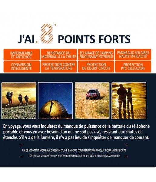 Batterie externe solaire Sans fil Induction de 80 000 mAh, idéale pour l’extérieur. Étanche, antichoc, avec charge rapide, 4 ports USB, fonction sans fil QI, lampe LED SOS et boussole intégrée, elle recharge jusqu’à 3 appareils simultanément pour une autonomie maximale en toutes circonstances.