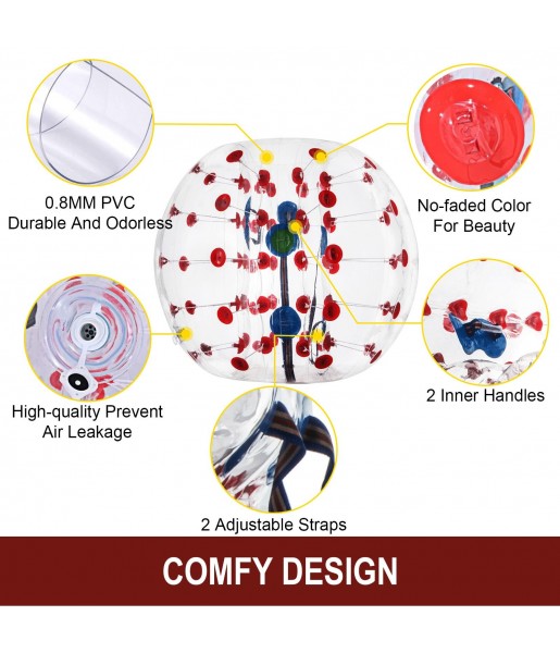 Les balles gonflables à bulles pare-chocs disposent de 2 poignées confortables et de 2 ceintures d'épaule réglables. De doubles protections garantiront votre sécurité pendant le jeu.