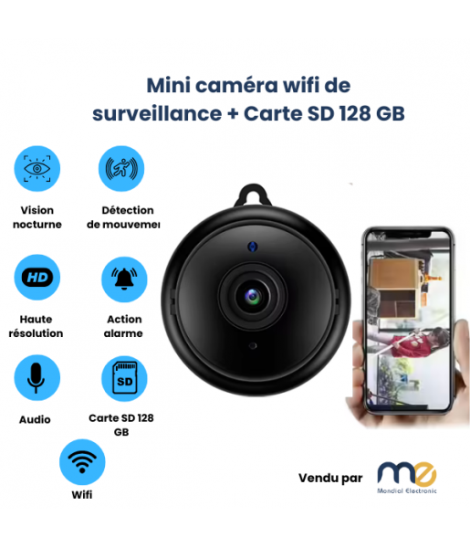 Mini caméra de surveillance intérieure sans fil, vision nocturne, audio bidirectionnel, détection de mouvement + Carte SD 128 GB