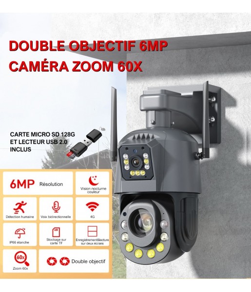 Caméra Surveillance Extérieure Double Objectif IP HD Sécurité 6MP 4G PTZ Sans Fil Zoom 60X+ Carte Micro SD 128G + Lecteur