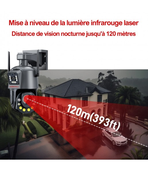 Cette caméra de surveillance extérieure est équipée de deux objectifs, offrant un zoom panoramique et une vision multi-angles. Elle dispose d'une vision couleur jour et nuit, d'un zoom optique 60X, d'une détection de mouvement et d'une alarme sonore. La résolution HD 6MP assure une vidéo claire et l'audio bidirectionnel permet de communiquer à distance.