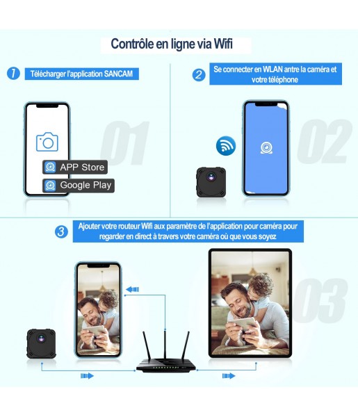 Grâce à l’application SANCAM téléchargeable sur l’Appstore ou sur Google play, vous pourrez connecter à votre Smartphone en WLAN pour rajouter votre caméra à un wifi proche afin que vous puissiez surveiller en direct votre maison ou bureau ou que vous soyez.