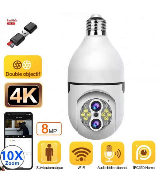Caméra de Surveillance Intérieure Ampoule 4K 8MP Zoom 10X Sécurité à Domicile WiFi Suivi automatique + Lecteur + Carte Micro SD
