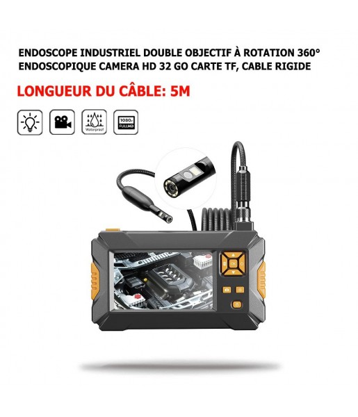 Cet endoscope industriel double objectif à Rotation 360° Endoscopique, est équipé d’une caméra d'inspection Boroscope, avec 9 LED Caméra serpent étanche IP68, 4,5" Pouces avec Câble de 10 mètres et une carte TF 32 Go.