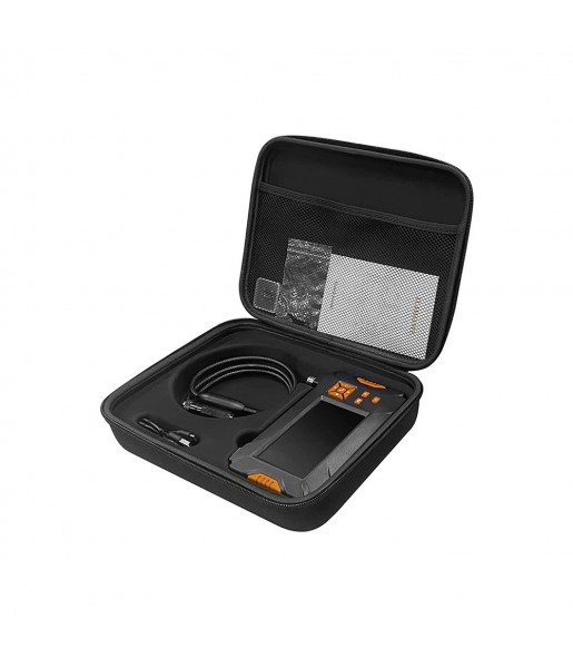 Contenu: endoscope industriel à double objectif IPS de 4,5 pouces, un câble semi-rigide de 5 m, un câble micro USB, une carte TF de 32 Go, mais aussi un un capuchon de protection, un crochet, un aimant, un étui de voyage et un manuel de l'utilisateur.