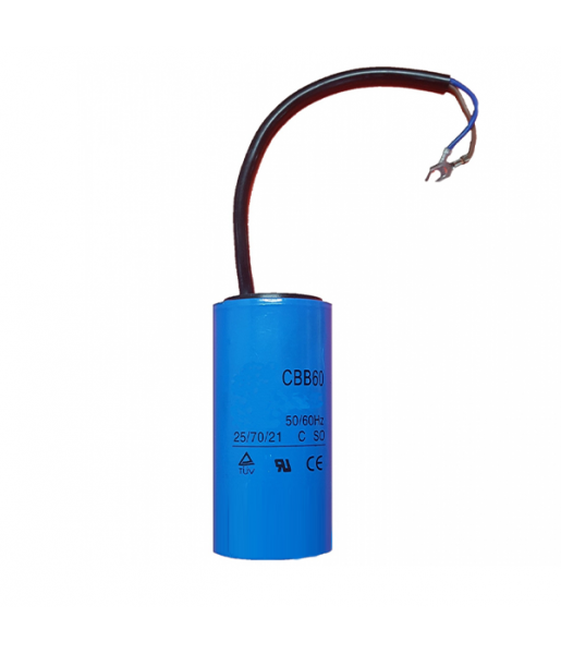 Condensateur permanent 1μF/450Vac pour moteurs électriques, condensateur de marche, avec diélectrique en polypropylène métallisé (construction sèche). La construction externe des condenseurs est dans un conteneur cylindrique avec un couvercle en PVC et une connexion électrique au moyen d'un tuyau. Référence : CBB60 1uF 450Vac