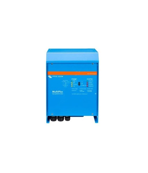 Description : Multifonctions, avec une gestion intelligente de l’énergie Le MultiPlus rassemble dans un seul boîtier compact un convertisseur sinusoïdal puissant, un chargeur sophistiqué à technologie de charge adaptative et un commutateur de transfert CA ultra rapide. En plus de ces fonctions de base, le MultiPlus offre de nombreuses caractéristiques avancées décrites ci-dessous. Deux sorties CA La sortie principale a une fonction d’alimentation ininterrompue. En cas de défaillance du réseau ou de déconnection de la puissance de quai ou du groupe, le MultiPlus prend la suite de l’alimentation des charges connectées. Ce transfert est si rapide (moins de 20 millisecondes) que le fonctionnement d’ordinateurs ou d’autres équipements électroniques sensibles raccordés ne seront pas perturbés. La deuxième sortie n’est sous tension que lorsque le CA est disponible sur l’une des entrées du MultiPlus. Des utilisateurs qui ne déchargeraient pas la batterie, comme un chauffe-eau par exemple, peuvent être connectés à cette sortie. Puissance virtuellement illimitée grâce au fonctionnement en parallèle Jusqu’à 6 Multi peuvent fonctionner en parallèle pour obtenir plus de puissance en sortie. Exemple: six unités 24/5000/120 fourniront une puissance de 25 kW / 30 kVA en sortie et 720 Amps de capacité de charge. Configuration triphasée En plus de la connexion en parallèle, trois unités peuvent être configurées pour une sortie triphasée. Mais ce n’est pas tout : jusqu’à 6 séries de 3 unités peuvent être raccordées en parallèle pour fournir une puissance de 75 kW / 90 kVA et plus de 2000 Amps de capacité de charge. Power Control: s’adapter aux limites d’un groupe, du quai ou du secteur Le MultiPlus comporte un chargeur de batteries très puissant qui demande de fortes intensités aux branchements à quai (près de 10A en 230 VAC par Multi de 5kVA). Le tableau de commande Multi Control permet de limiter la puissance à fournir par le quai ou par le groupe électrogène. Le MultiPlus prend alors en compte la demande de puissance AC en sortie et n’utilisera que l’excédent pour la charge, évitant ainsi toute surcharge du quai ou d’un groupe électrogène. PowerAssist – Davantage de puissance fournie par le quai ou le groupe Cette fonction donne une dimension supplémentaire au principe du Power Control En permettant au MultiPlus de compléter la capacité de la source alternative. En cas d’une demande de forte puissance de pointe (souvent requise pour une courte durée lors de démarrage d’un moteur électrique), le MultiPlus fournit par son convertisseur et les batteries la puissance complémentaire à la puissance limitée du quai ou du groupe. Lorsque la demande diminue, l’excédent de puissance est utilisé pour recharger les batteries. Charge adaptive en quatre étapes et chargement de deux bancs de batterie La sortie principale fournit une charge puissante au système de batterie grâce à un logiciel avancé de "charge adaptive". Le logiciel ajuste les trois étapes du processus automatique pour s’adapter à l’état de la batterie, et il en rajoute une quatrième pour les longues périodes de chargement « float ». Le processus de charge adaptative est détaillé dans la fiche technique du Chargeur Phoenix et sur notre site Web, à la section Informations Techniques. De plus, le MultiPlus chargera une deuxième batterie en utilisant une sortie de charge d’entretien indépendante destinée à des batteries de démarrage de générateur ou de moteur principal (sortie de charge d’entretien disponible seulement sur les modèles de 12 V et 24 V). La configuration du système n’a jamais été aussi simple Une fois installé, le MultiPlus est prêt à être utilisé. Si des paramètres doivent être changés, cela se fait en quelques minutes avec une nouvelle procédure de réglages des interrupteurs DIP. Même le fonctionnement en parallèle ou triphasée peut être programmé par des interrupteurs DIP : aucun ordinateur n’est nécessaire! Sinon, VE.Net peut être utilisé à la place des interrupteurs DIP.