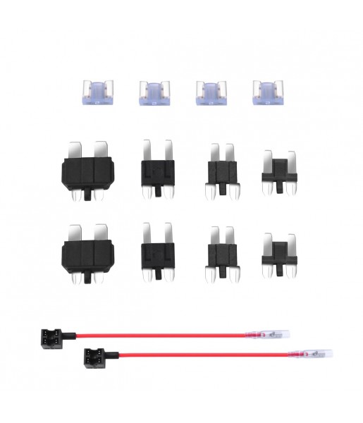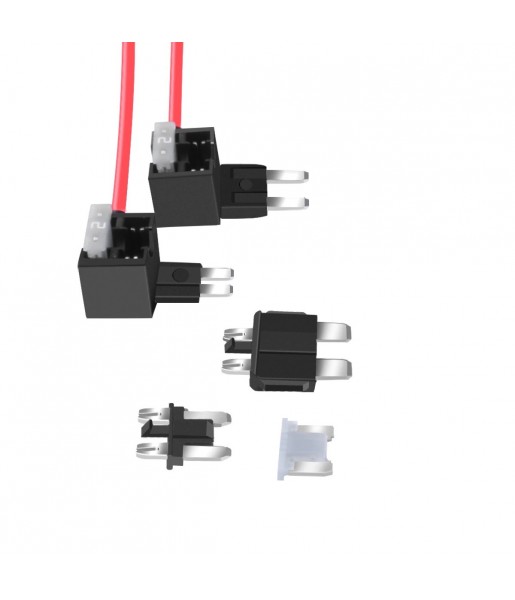 Câble d'alimentation pour les nouvelles dashcams. Différents types de fils de prise de courant, d'adaptateurs et de fusibles sont attachés et peuvent être appliqués à la majorité des dashcams.