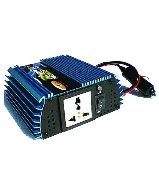 Convertisseur pseudo sinus 200 W - 12 V Le convertisseur est capable d'alimenter simultanément, à partir du dispositif de batteries en 12 Volts, plusieurs appareils électriques dans la mesure où la somme des puissances nominales de chacun des appareils (en fonctionnement) ne dépasse pas 200 Watts. Ce type de convertisseur peut aisément alimenter les appareils suivants : chargeur PDA, téléphone, MP3, télévision, chaîne hi-fi, éclairage, ventilateur, etc... - Dans des lieux dépourvus d'arrivée électrique : un garage, un cabanon, un abri de jardin, un bateau, un camping, une caravane, une hutte de chasse, un chalet d'enfants, un atelier, etc. - En cas de coupure de courant électrique : intempéries, inondations, tempête, travaux publics, etc. Attention ! Ce convertisseur offre un signal de sortie électrique de moins bonne qualité qu'un convertisseur pur sinus de même puissance. Points forts : - Rendement supérieur à 90% ; - Fusible externe de 25 Ampères ; - Livré avec une prise externe allume cigare ; - Excellente dissipation thermique ; - Interrupteur Marche Arrêt et indicateur de surcharge en façade. Caractéristiques : - Rendement : supérieur à 90% ; - Puissance maximale en crête : 400 Watts ; - Tension de sortie : 230 Volts +/- 10 % ; - Courbe de sortie : 50 Hz - Sinusoïdale modifiée ; - Consommation à vide : < 0,3 A ; - Plage d'alimentation : 11 à 14,5 Volts ; - Coupure en cas de surtension d'alimentation : Au delà de 15 Volts continus ; - Coupure en cas de sous tension d'alimentation : En dessous de 11 Volts continus ; - Alarme de sous alimentation : Sonore ; - Protection thermique : oui ; - Coupure en cas de court-circuit : oui ; - Prise(s) 230 Volts en façade : 1 prise ; - Dimensions : 18 x 9 x 5 cm ; - Poids : 0,65 kg.