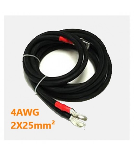 Câble raccordement batterie-convertisseur 4AWG 2x25mm2 - d'une installation en 12 Volts avec un convertisseur d'une puissance inférieure à 2 000 Watts ; - d'une installation en 24 Volts avec un convertisseur d'une puissance inférieure à 2 500 Watts. Un câble inadapté peut entraîner des pertes de performances, des dysfonctionnements graves voire des accidents (incendies). - 1 câble avec repère noir ; - 1 câble avec repère rouge. Les extrémités de ces câbles sont équipées de cosses à œil serties de 10 mm de diamètre Ø 10 destinées à assurer un raccordement aisé (boulons) sur la batterie et sur le convertisseur.