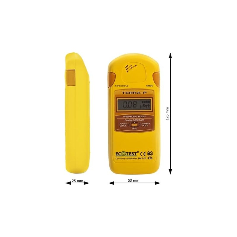 Le dosimètre vous aidera à vérifier la sécurité des radiations de votre maison, lieu de travail et de loisirs, voiture, articles ménagers, matériaux de construction de vêtements, baies sauvages et champignons. De plus, Ecotest Terra-P MKS-05 mesure le niveau de fond gamma et la dose accumulée, estime la contamination par la bêta-. Il est conçu dans un boîtier antichoc jaune et est de taille compacte.
