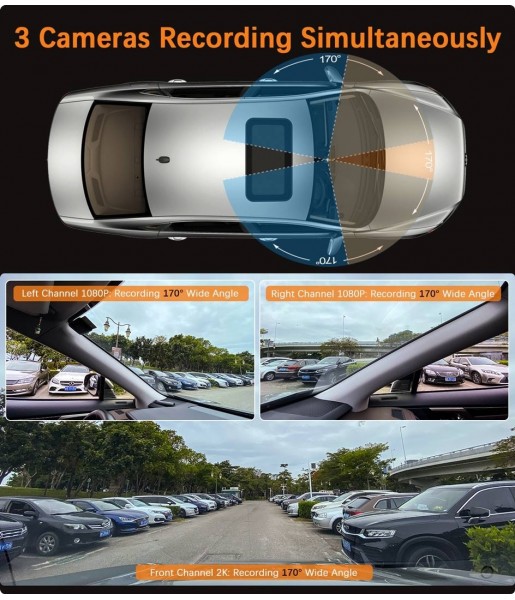 Triple caméra grand angle 170° : enregistrement simultané à l’avant, à gauche et à droite avec une résolution 2K à l’avant et 1080P sur les côtés pour une couverture complète.