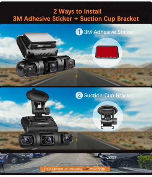 Caméra de voiture Range Tour avec triple lentilles grand angle, vision nocturne, GPS en option et connexion WiFi. Sécurité optimale et enregistrement continu, idéale pour tous vos trajets.