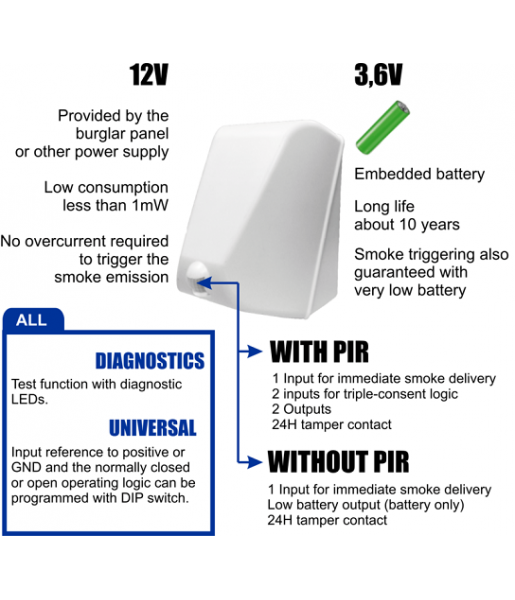 Nubi 4.0 est une gamme de produits adaptés à la protection des environnements intérieurs contre le vol, transformant le système d'alarme en un véritable système de protection . Il peut être connecté à n'importe quel panneau d'alarme existant et, en cas de vol, déclenche la cartouche de fumée installée qui en quelques secondes sature l'environnement protégé empêchant les intrus de voir et de s'orienter. Le déclenchement de fumée peut être soumis au double contrôle réalisé par le capteur infrarouge passif intégré, afin d'éviter les fausses alarmes, ainsi qu'à une commande directe assurée également à distance via un système de contrôle vidéo à distance. NUBI 4.0 consomme une quantité d'énergie insignifiante pour son fonctionnement, peut être alimenté en 12V ou avec une batterie au lithium d'une durée de 10 ans, pour les deux tensions d'alimentation est disponible à la fois dans la version complète avec infrarouge passif, à la fois dans la version simplifiée sans infrarouge et avec activation immédiate uniquement. Caractéristiques principales : Cette version est alimentée par une pile au lithium de 3, 6 V (AA), fournie avec le produit et installée sur la carte mère, d’une autonomie d’environ 10 ans. Le circuit de stockage d’énergie spécial active la cartouche de fumée même lorsque la batterie est presque complètement déchargée. Cette version a un capteur de son pour activer la fumée immédiatement si votre sirène d'alarme est déclenché et que le détecteur infrarouge du NUBI 4 confirme la présence d'un malveillant. Pour éviter les émissions de fumée accidentelles après l’installation et pour vérifier le fonctionnement, pendant les 30 premières minutes suivant l’alimentation électrique, la fumée ne sera pas activée immédiatement, mais après une période d’avertissement de 2 minutes pendant laquelle il est possible d’interrompre la procédure d’allumage de la cartouche. Très faible consommation Grâce à l’absence d’une chaudière a une consommation extrêmement faible, économise l’énergie et l’argent de la facture d’électricité, puis aime l’environnement. Non-toxique La fumée émise par les NUBI 4.0 ne génère pas d’atmosphère toxique, comme celle de la directive UE TLV-STEL 2017/164 et de l’ACGIH. Après utilisation, il est suffisant pour ventiler la pièce avant de rester là et la cartouche usagée peut être éliminée comme n’importe quel multi-matière. NUBI 4.0 est le plus petit dans la catégorie, installe sur le mur ou dans le coin. Le boîtier en plastique blanc assure un impact visuel minime, dans certains cas, il peut être facilement peint avec la même couleur que le mur. Intelligente Le capteur de présence intégré avec algorithme de traitement intelligent réduit considérablement le risque de fausses alarmes, surtout lorsque les NUBI 4.0 sont insérés dans un système d’alarme antivol existant. Universel Disponible en versions avec interface filaire et radio pour être apparié avec n’importe quel système d’alarme existant ou avec une unité de commande intégrée.