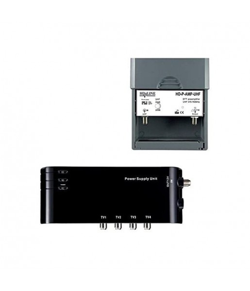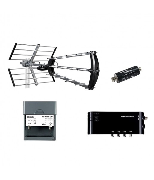 Ce kit à 4 sorties comprend : - un préamplificateur de mât à gain variable (20-38db max) ; - une alimentation 12V 4 sorties ; - une antenne d'extérieure Trinappe 26dB UHF avec Filtre 4G intégré.