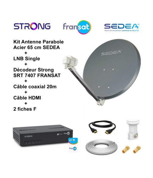 Profitez d’une réception satellite optimale avec ce kit complet comprenant une parabole acier 65 cm SEDEA (36,5 dB), un LNB Single Full HD 4K, un décodeur Strong SRT 7407 FRANSAT, un câble coaxial de 20 m, un câble HDMI et 2 fiches F. Idéal pour capter les chaînes en haute définition, même en zone difficile.