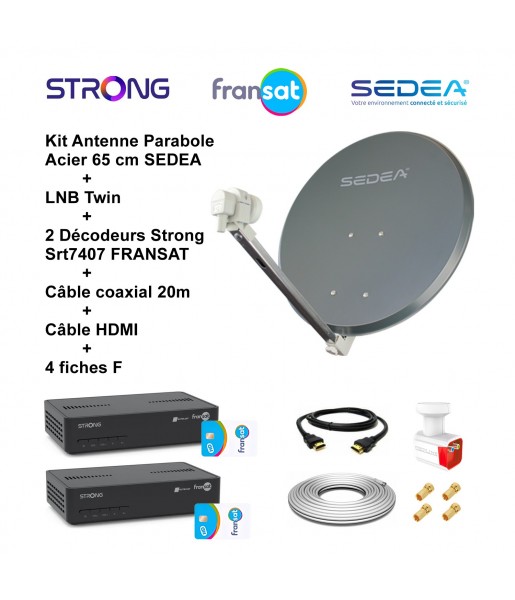 Kit Parabole Acier 65 cm Anthracite + LNB Twin 0,1 dB HD 2 Décodeurs Strong SRT 7407 Câble coaxial 20m Câble HDMI 4 fiches F