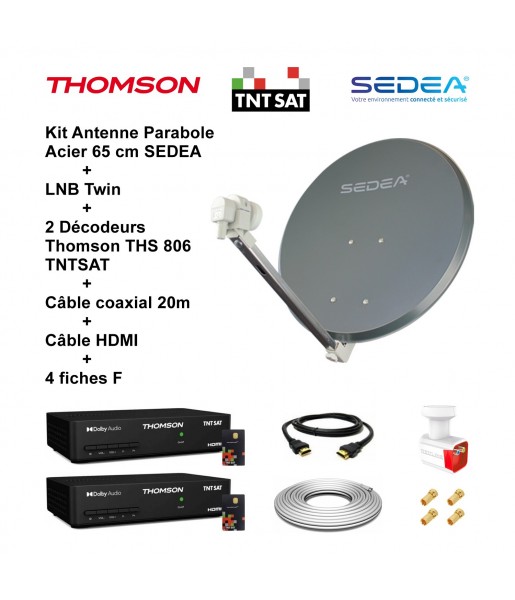 Kit Parabole Acier 65 cm Anthracite + LNB Twin Full HD 4K 2 Décodeurs THS 806 TNTSAT Câble coax 20m Câble HDMI 4 fiches F