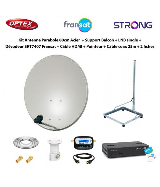 Kit Parabole 80cm Acier + Support Balcon + LNB Single + Décodeur SRT7407 Fransat + Câble HDMI + Pointeur + Câble Coax 25m + 2 fi