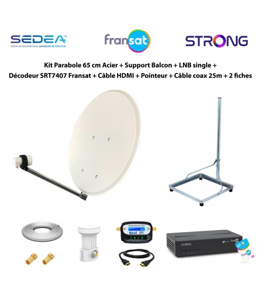 Le Kit Parabole 65 cm Acier est la solution idéale pour recevoir les chaînes de la TNT HD via le satellite Fransat, sans abonnement ni complication. Ce pack complet comprend une parabole 65 cm SEDEA Click-Clack en acier galvanisé, un décodeur STRONG SRT 7407 HD Fransat, un support de balcon stable, un LNB universel single, un pointeur satellite, un câble HDMI, un câble coaxial de 25 m et deux fiches F.