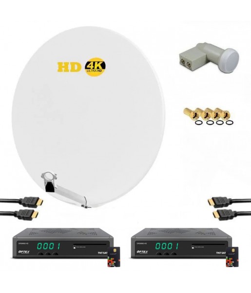 Kit complet HD/4K avec parabole en fibre blanche 85 cm, LNB Twin et 2 récepteurs TNTSAT avec cartes incluses, pour une réception satellite optimale et facile.