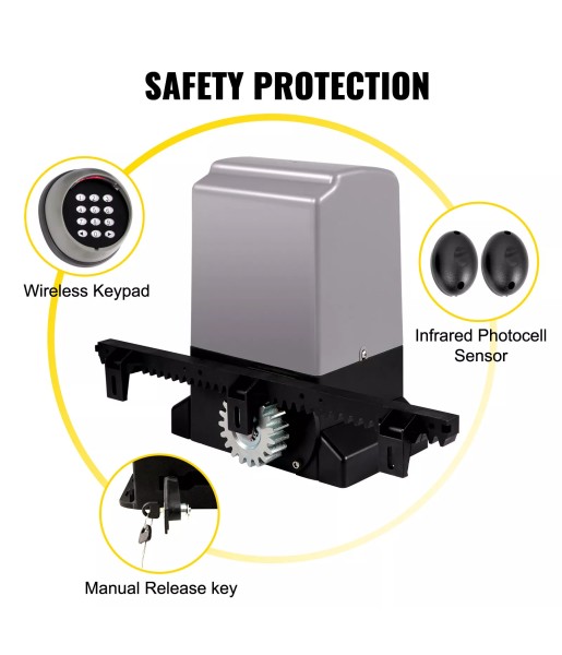 L'opérateur de portail coulissant dispose d'un clavier sans fil, d'un capteur infrarouge et de touches de déverrouillage manuel pour assurer une protection de sécurité. Le moteur est doté d'un protecteur de température pour éviter toute surcharge du moteur.