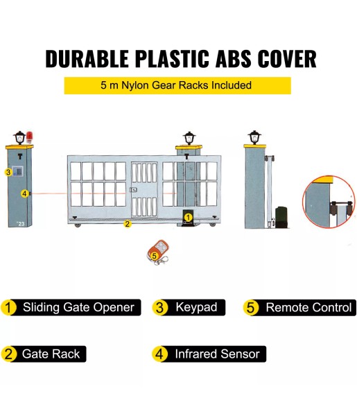 Ce kit de portail de clôture coulissante est composé d'un matériau ABS de haute qualité et de crémaillères en nylon de 16,4 pi/5 m. Max. Longueur de la porte : 39 pi/12 m. La coque durable est résistante aux intempéries pour une longue durée de vie.