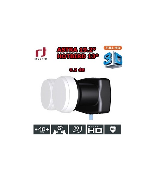 Le LNB Monobloc 6° Single 0.2dB Inverto Black Pro assure la réception simultanée d’Astra et Hotbird avec une qualité HD stable, une faible consommation et un bruit minimal de 0,2 dB.