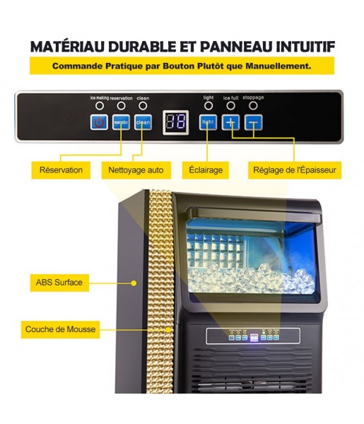 Fonctionnalités pratiques : nettoyage automatique, réservation de production et choix de taille de glaçons.