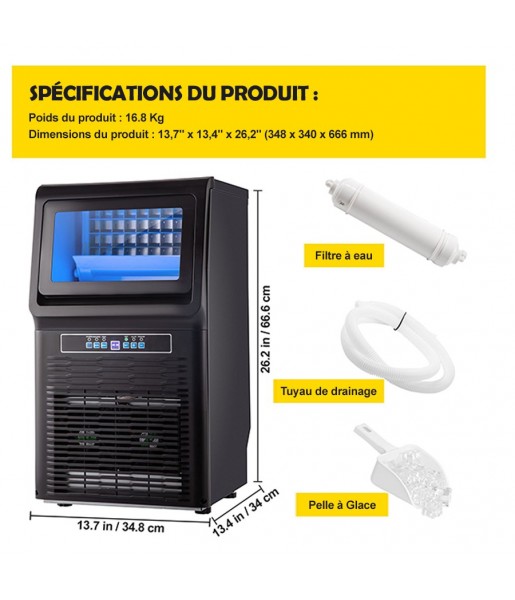 - Filtre à eau, Bac à Glaçon, Tuyau d'évacuation, Pelle à glace, Câble d'alimentation