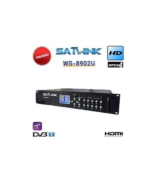 Le Satlink WS 8902U est un modulateur numérique HD 8 voies DVB-T H.264 avec entrées HDMI/CVBS, écran LCD 2,4" et puissance RF réglable, idéal pour la diffusion HD multi-source.