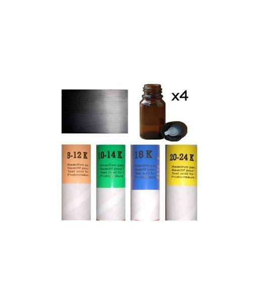 Testez rapidement et facilement vos bijoux avec le Kit 4 tests OR - 9 - 14 - 18 - 24 K. Complet et précis, il inclut une pierre naturelle, 4 flacons et un guide pour déterminer l’or 9K, 14K, 18K et 24K en toute fiabilité. Idéal pour bijoutiers et passionnés d’or.