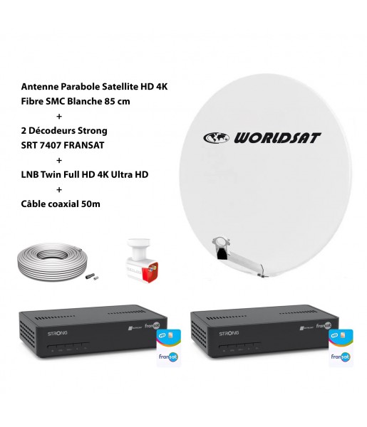 Kit Antenne Parabole Sat HD 4K Fibre SMC Blanche 85cm WORLDSAT Kit Antenne Parabole Sat HD 4K Fibre SMC Blanche 85cm WORLDSAT Décodeur Strong SRT 7407 FRANSAT Décodeur Strong SRT 7407 FRANSAT LNB Twin 4K Ultra Full HD LNB Twin 4K Ultra Full HD