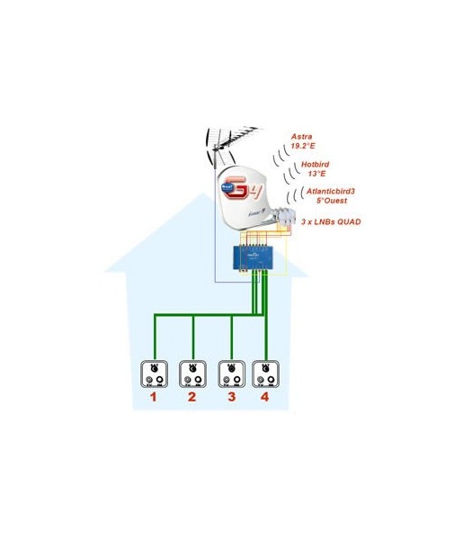 Kit parabole BISAT G4 avec antenne, LNB Quad premium et commutateur, pour recevoir toutes les chaînes françaises sur 4 téléviseurs indépendants.