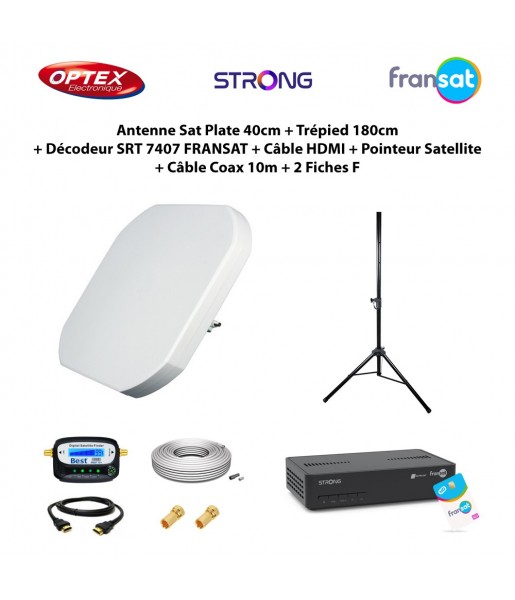 Antenne Sat Plate 40cm + Trépied 180cm + Décodeur SRT 7407 FRANSAT + Câble HDMI + Pointeur Satellite + Câble Coax 10m + 2 Fiches F