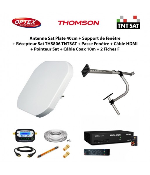 Antenne Sat Plate 40cm + Support de fenêtre + Récepteur Sat THS806 TNTSAT + Passe Fenêtre + Câble HDMI + Pointeur + Câble Coax 1