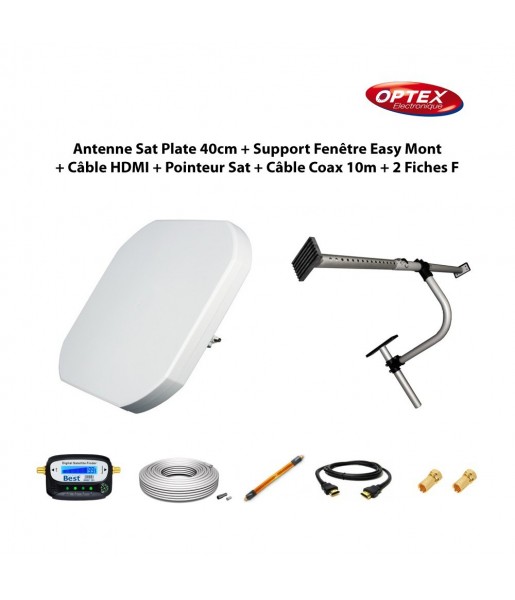 Antenne Sat Plate 40cm + Support Fenêtre Easy Mont + Câble Passe Fenêtre + Câble HDMI + Pointeur Sat + Câble Coax 10m + 2 Fiches